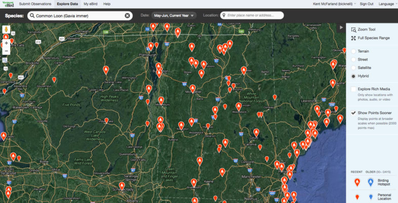 Common Loon sightings reported to Vermont eBird during the first week of May 2017. Click on the map to see a live version at Vermont eBird.