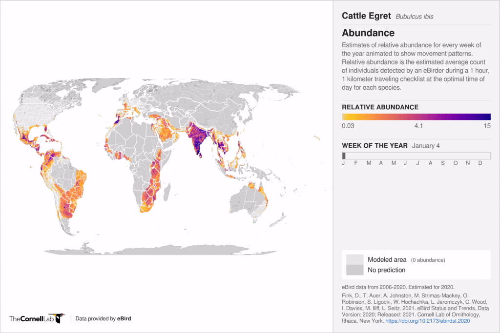 Estimates of relative abundance for Cattle Egret for every week of the year animated to show movement patterns throughout its global range.