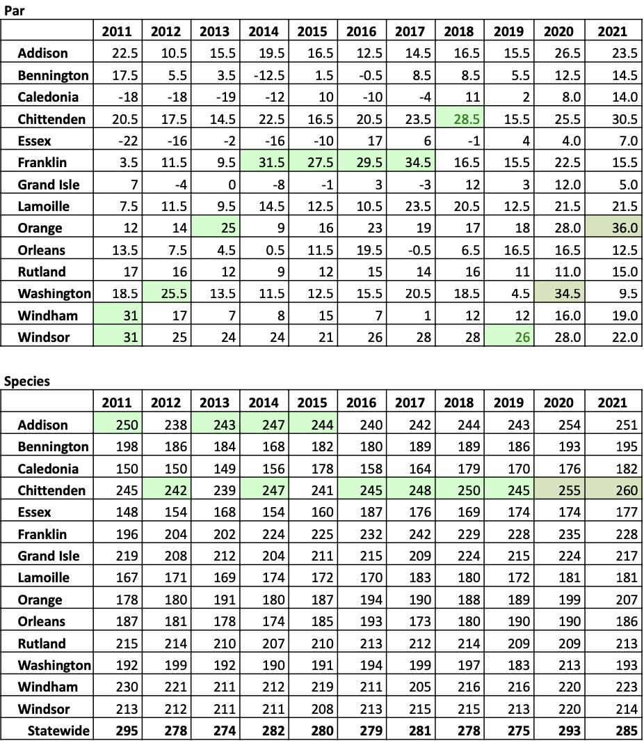 With 36 birds over par, Orange County had an amazing birding year and blew the competition away. Congratulations to all the birders who helped the county claim the 2021 Quest Cup. Chittenden county, the perennial ‘birdiest’ county in Vermont placed second with 30.5 birds over par.
