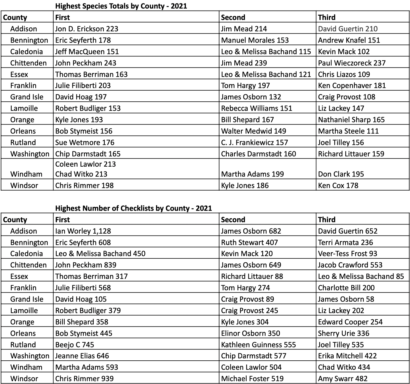 Visit the Vermont eBird Top 100 list to get a full tally of Checklist and Species List Champions for any year. Simply select the county and year you are interested and see where you ranked, too!