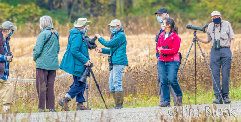A familiar site in Norwich (and elsewhere) during 2020: birders wearing masks. This group was watching the cooperative Western Kingbird at Campbell Flat, September 2020. © Jim Block https://www.jimblockphoto.com/