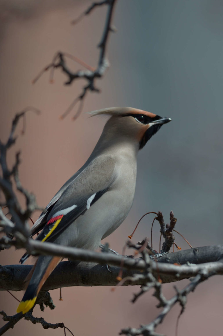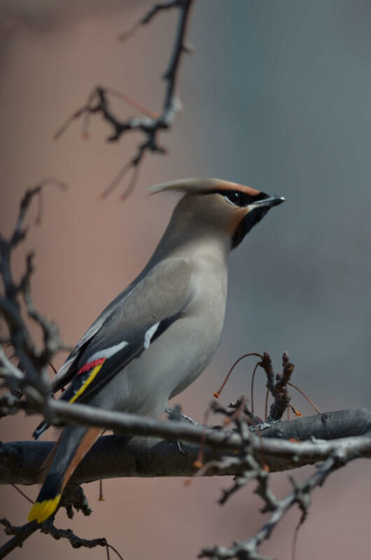 A Bohemian Waxwing that appears to have consumed all the crab apples in sight. This nomadic species sometimes appears in impressive numbers in the Northeast, with flocks numbering in the hundreds. This winter, Norwich and the Upper Valley have so far seen just a smattering of these elegant birds. © Nathaniel Sharp