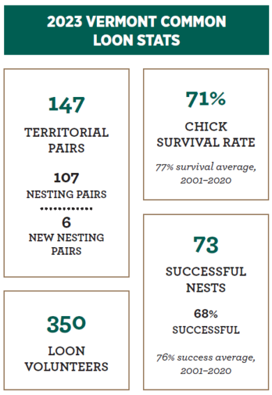 This success becomes even more vital in light of the historic flooding that took place this summer. Because the rain came in early July, only six loon nests were inundated. VCE Loon Biologist Eric Hanson speculates that if the six-to-ten inches of rain had come a few weeks earlier, in the height of nesting season, the damage could have been much worse. With weather like this predicted to become more common, it is more important than ever to continue to monitor and manage these birds to ensure future success.