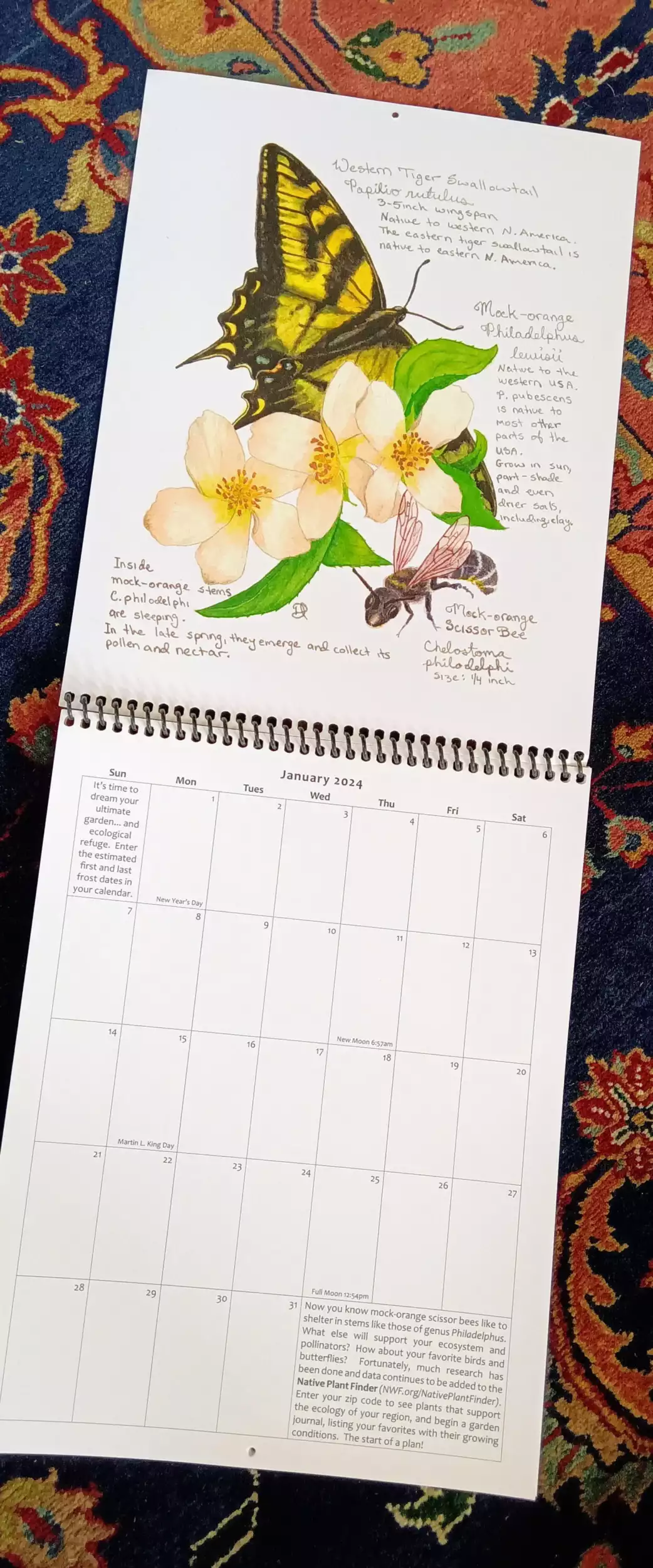 Local Vermont artist and geographer Daisy Hebb’s 2024 “Native Plants & Their Pollinators Calendar” is now available! Each month features a gorgeous watercolor image of flowers and their pollinators that were all native to North America pre-colonization. Aside from helping your loved ones plan their schedule, this calendar also provides information on each species, such as common and scientific names, and each plant’s region and basic growing conditions. To create the bee images, Daisy consulted with VCE biologist Spencer Hardy for advice about bees and their host plants.