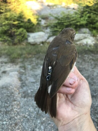 A female Bicknell’s Thrush with a radio transmitter on its back Photo by Desiree Narango