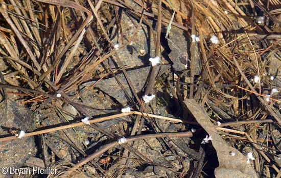 Male Spotted Salamanders leave their hibernation burrows ahead of the females and arrive first at the pools. They form large balls of wiggling males called congresses. As females arrive, individual males separate from the congress and perform a courtship dance with a female. They circle and put their heads under each other’s tails. The male may climb on her back and rub her with his chin. He then swims away wiggling his tail. If the female is interested, she will follow him. He leads her to a sperm packet, called a spermatophore, he deposited earlier on submerged leaves or twigs on the bottom of the pool. She picks up a packets through her cloaca, an opening under the base of the tail used for egg-laying, excreting waste, and of course egg fertilization. The female may collect packets from several males. She then lays several hundred eggs in small gelatinous balls.