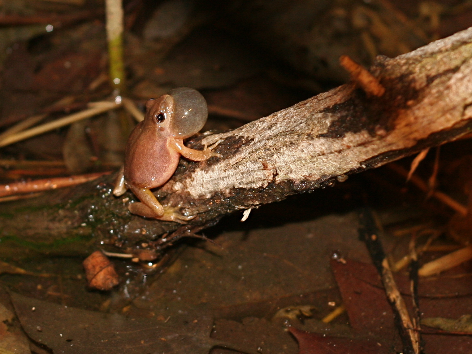 The cacophony of calling is made up of hundreds of male spring peepers. Each peep call is made by forcing air from their lungs over vocal cords in the larynx and into an air sac in their throat. The air enters the sac from openings on each side of the mouth cavity causing it to balloon outward with air. The inflated sac amplifies and transfers the sound energy from the frog to my ears across the valley.