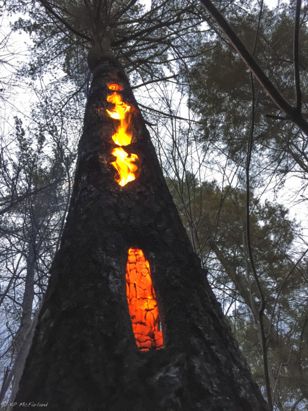 Spring forest fire encounters a hollow tree where a Pileated Woodpecker searched for food. / © K.P. McFarland