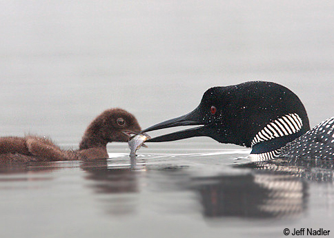 Male and female Common Loons both tend to their young, feeding insects and minnows at first and larger fish later. Although loons will eat almost any fish they catch, perch are a favorite food. A loon’s average dive length is 35-40 seconds. Most fish are swallowed underwater with only the occasional larger fish brought to the surface. In a loon’s gizzard, which contains small stones, powerful enzymes and stomach acids help to digest the fish – bones included.