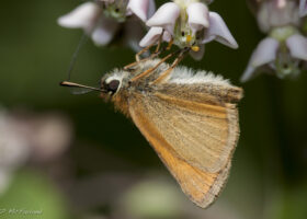 European Skipper with pollinia stuck to its foot while nectaring milkweed. / © K.P. McFarland
