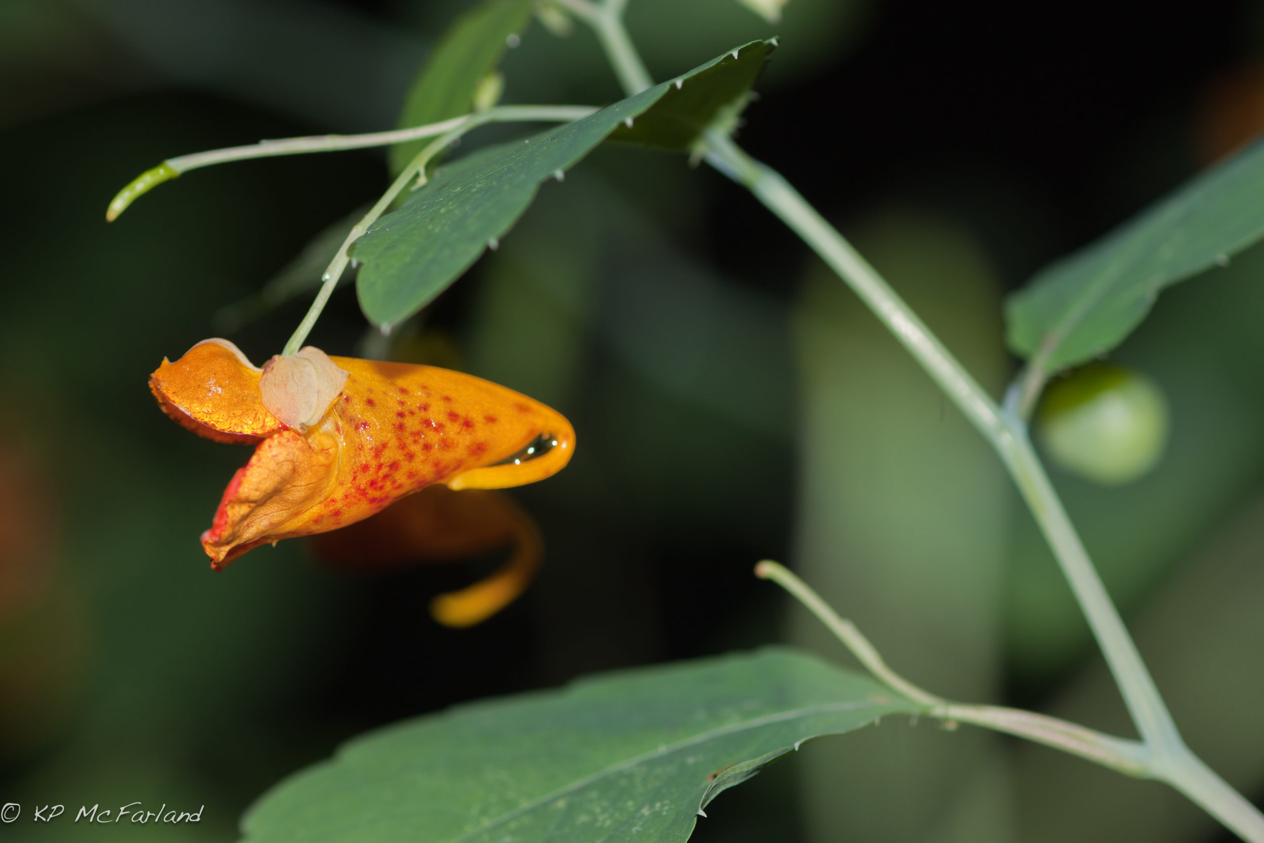 Each jewelweed flower hangs from a stem with just enough tension to allow it to spring back and forth as the hummingbird feeds, depositing pollen on top of the bird’s bill and forehead. When the hummingbird visits another flower, the pollen it carries is brushed off, thus fertilizing a new flower.