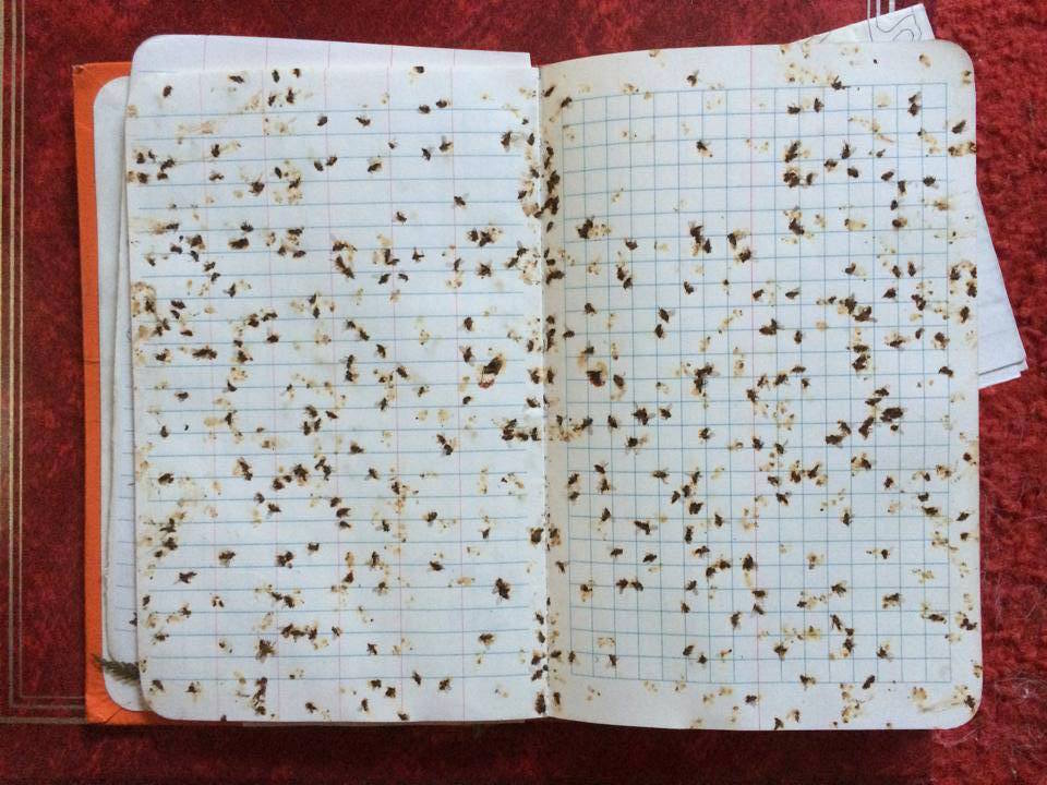 Noel Dodge was one of our best student interns on the Bicknell’s thrush project. He’s now a professional biologist and still working hard on conservation issues and still comes up to Mt. Mansfield from time to time to help us band birds. One day while banding Bicknell’s Thrushes on Stratton Mountain, he decided to collect a sample of blackflies around us. His method? Field notebook slaps. Here’s a few hours of work on June 16, 2002. Field work can be tough! Imagine our necks and ears after that morning!
