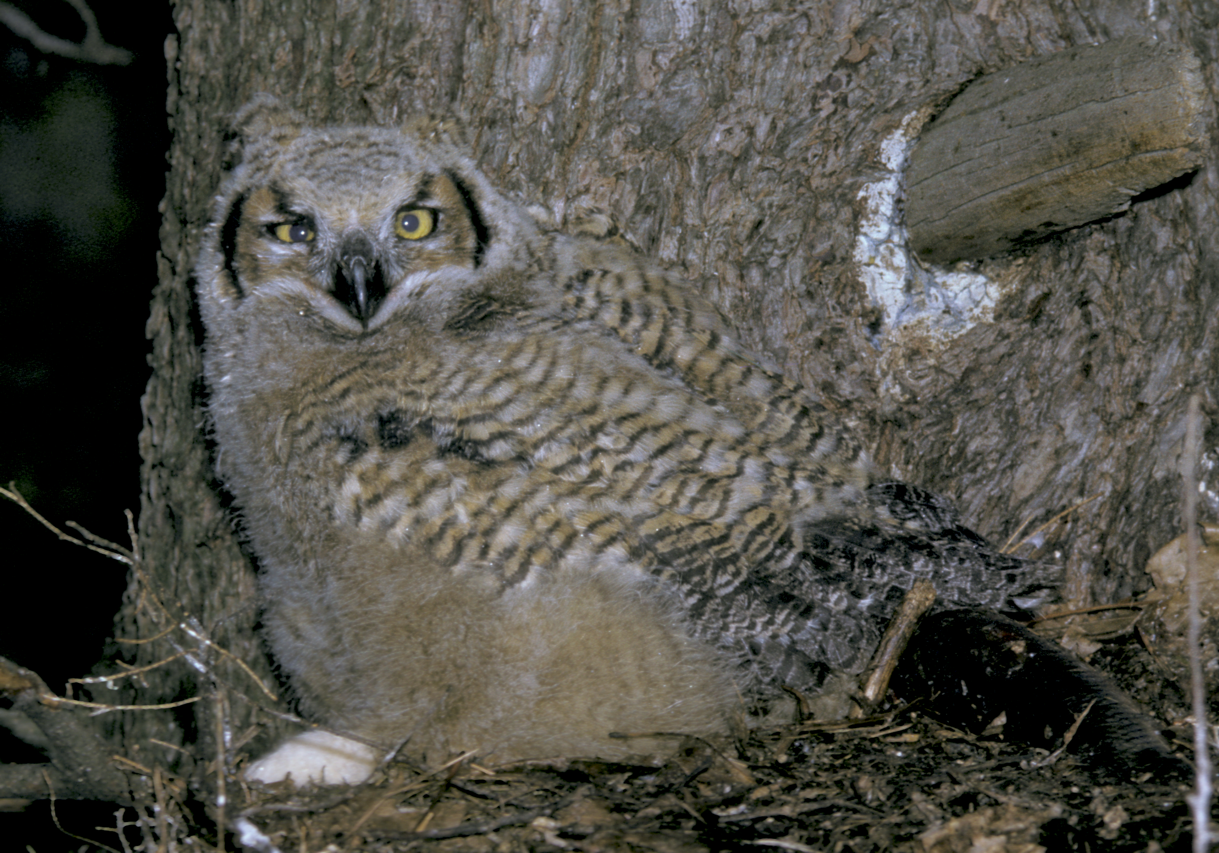 As songbirds begin to arrive, some Great Horned Owls have already completed incubation by the end of March.They’ve been sitting on eggs for about four weeks. After hatching, the young owls fledge in 40 to 45 days, but remain dependent upon their parents for food until they can fend for themselves. Nests often consist of sticks and vary widely in size, depending on which species originally built the nest (usually Red-tailed Hawks, other hawk species, crows, ravens, herons, or squirrels). Great Horned Owls may line the nest with shreds of bark, leaves, downy feathers plucked from their own breast, fur or feathers from prey, or trampled pellets.