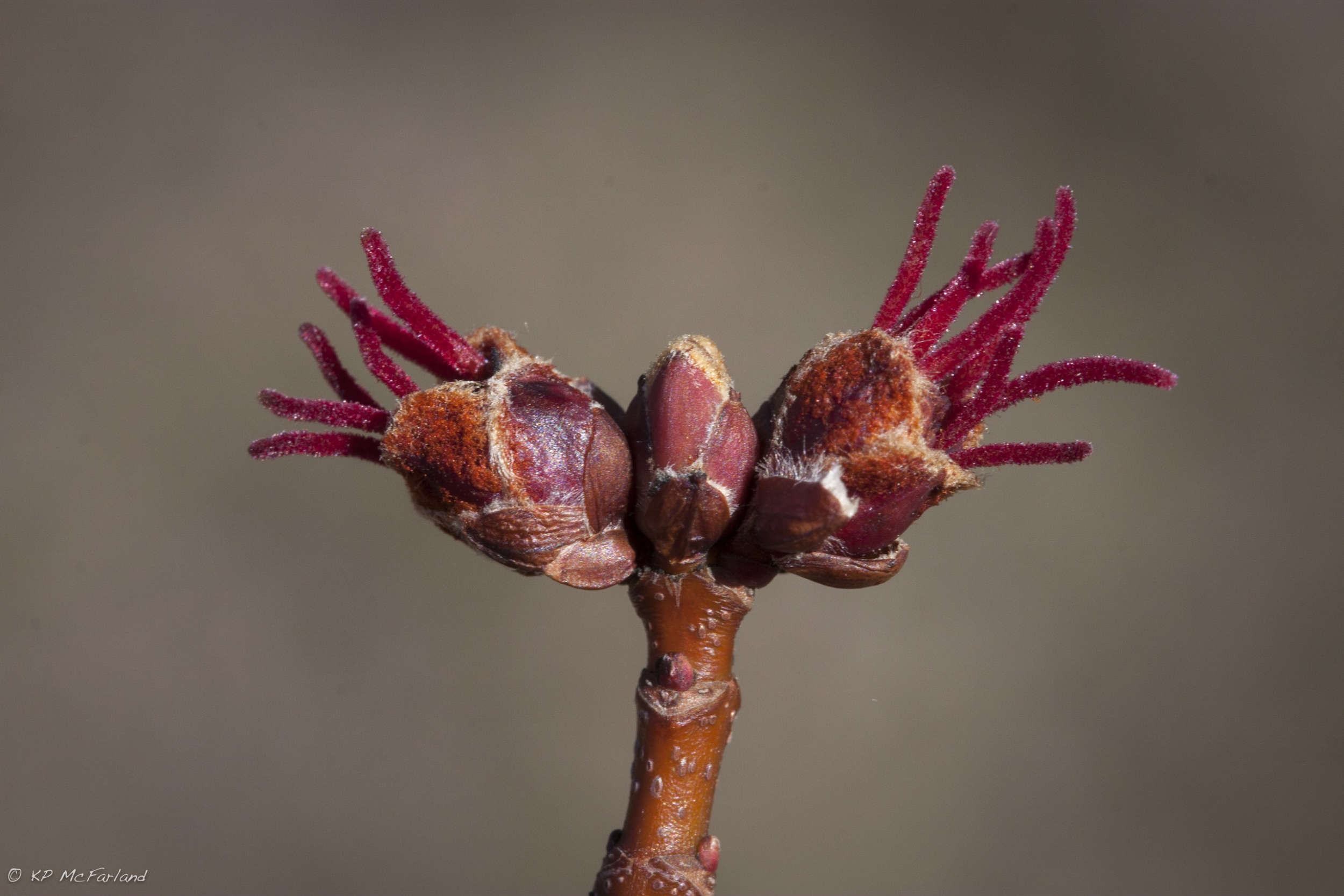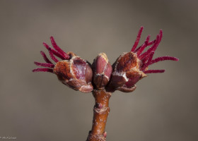 Silver Maple (Acer saccharinum) is the first of the maples to bloom in North America, beginning as early as February in the southern part of its range and extending into May in the north. Flowers bloom long before the leaves appear. Because pollen is produced so early in spring, it may be important for bees and other pollen-dependent insects. Most references describe silver maple as wind pollinated, but insect pollination may be important, as many bees visit the flowers. Seeds develop rapidly: within 24 hours of pollination, flower parts wither and ovaries begin to swell.