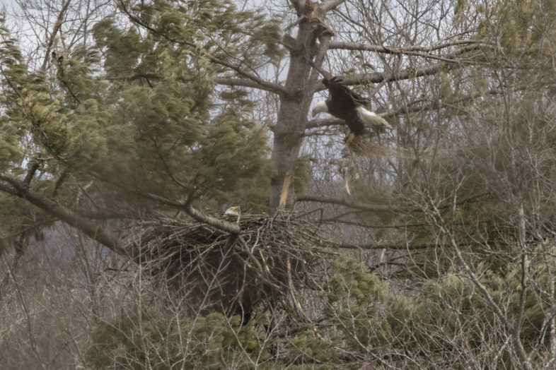 An image taken from a great distance of a male Bald Eagle delivers nesting material to a waiting female along the Connecticut River. / © K.P McFarland