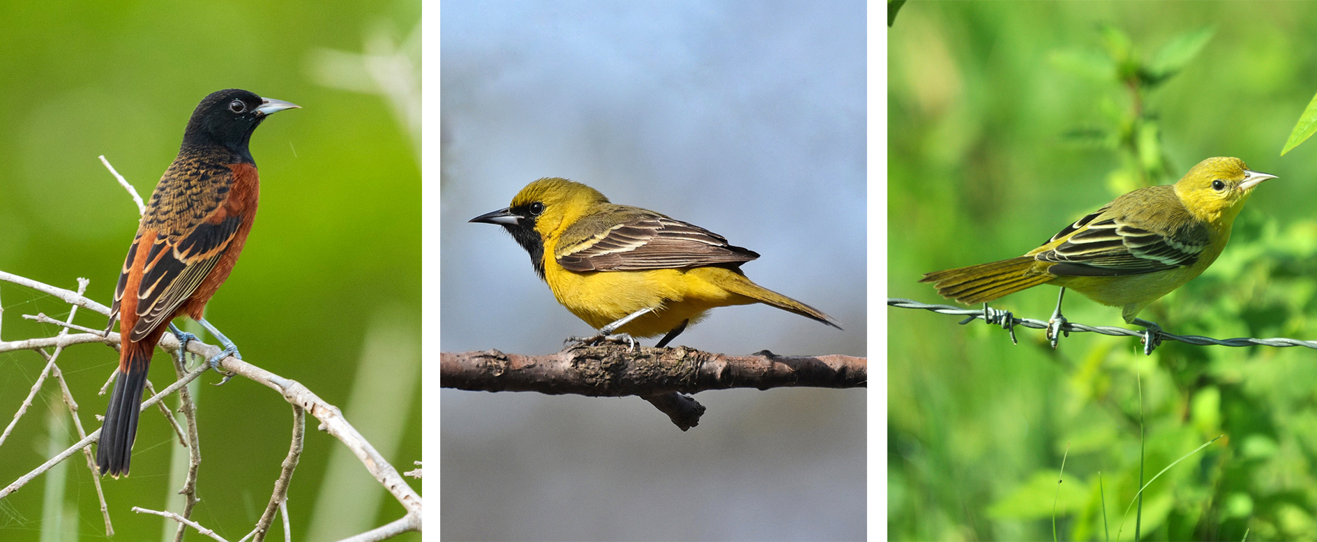 Orchard Orioles on their Latin American wintering grounds. From left: adult male (© Miguel Díaz), yearling male (© Karine Scott), female (© Carlos Alvarez N.).