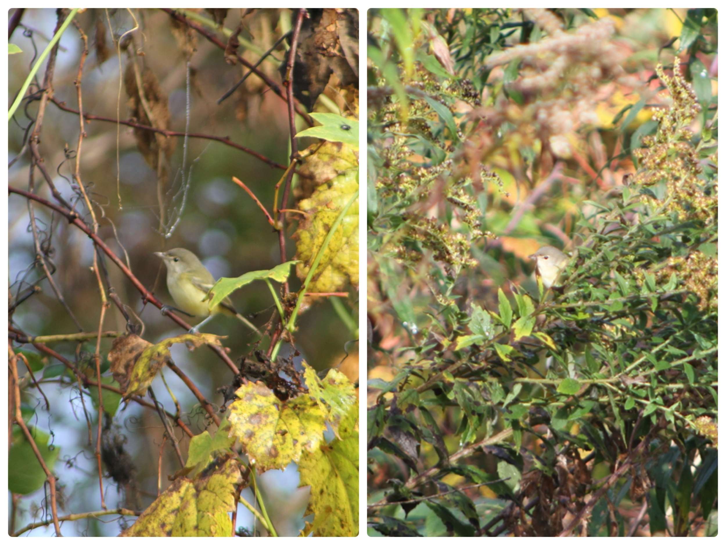 Kyle Jones’ original two photos of a Bell’s Vireo he discovered on the Ottauqueechee River Trail in Woodstock on 15 October 2021, and sent to C. Rimmer for an ID opinion. Wing bars, what wing bars?? © Kyle Jones