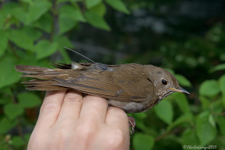 An adult Bicknell’s Thrush prior to (left) and just after (right) receiving a miniaturized, lightweight GPS tag programmed to collect critical data on its movements and habitat use over the next 11+ months. Mt. Mansfield, 8 June 2021. © Charles Gangas