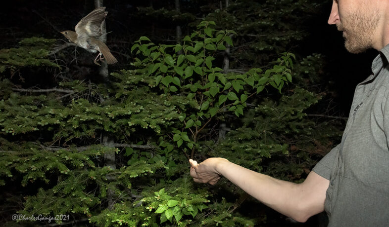 Chris Hansen releases one of the first Bicknell’s Thrush to carry an archival GPS tag at dusk on 7 June 2021, Mt. Mansfield. © Charles Gangas