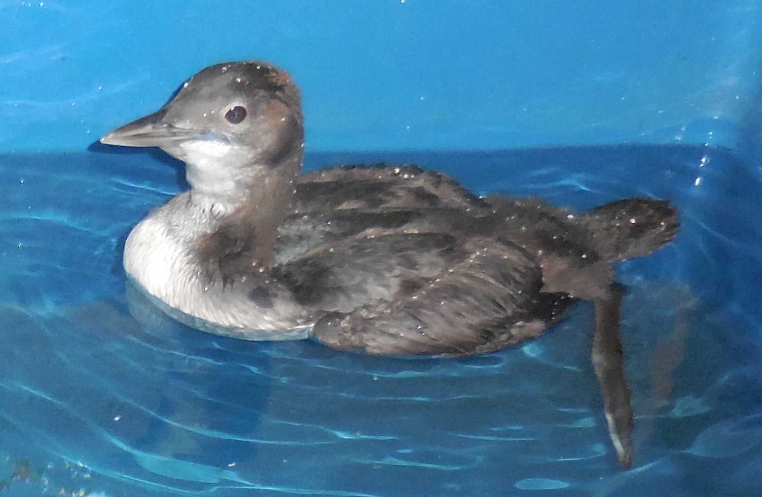 Your loon chick is doing very well so far. As Kappy had noted, her waterproofing is not great, but she can dive, and it takes several hours for her back to get a little wet. She stays dry underneath, which is good. As of yesterday, she learned to get herself up on the pool haul-out, so we feel comfortable leaving her in the pool knowing that, when she feels she needs to be out, she can get out on her own. Rather than try a second bath, our plan is to see if she can get her back feathers into shape by preening.