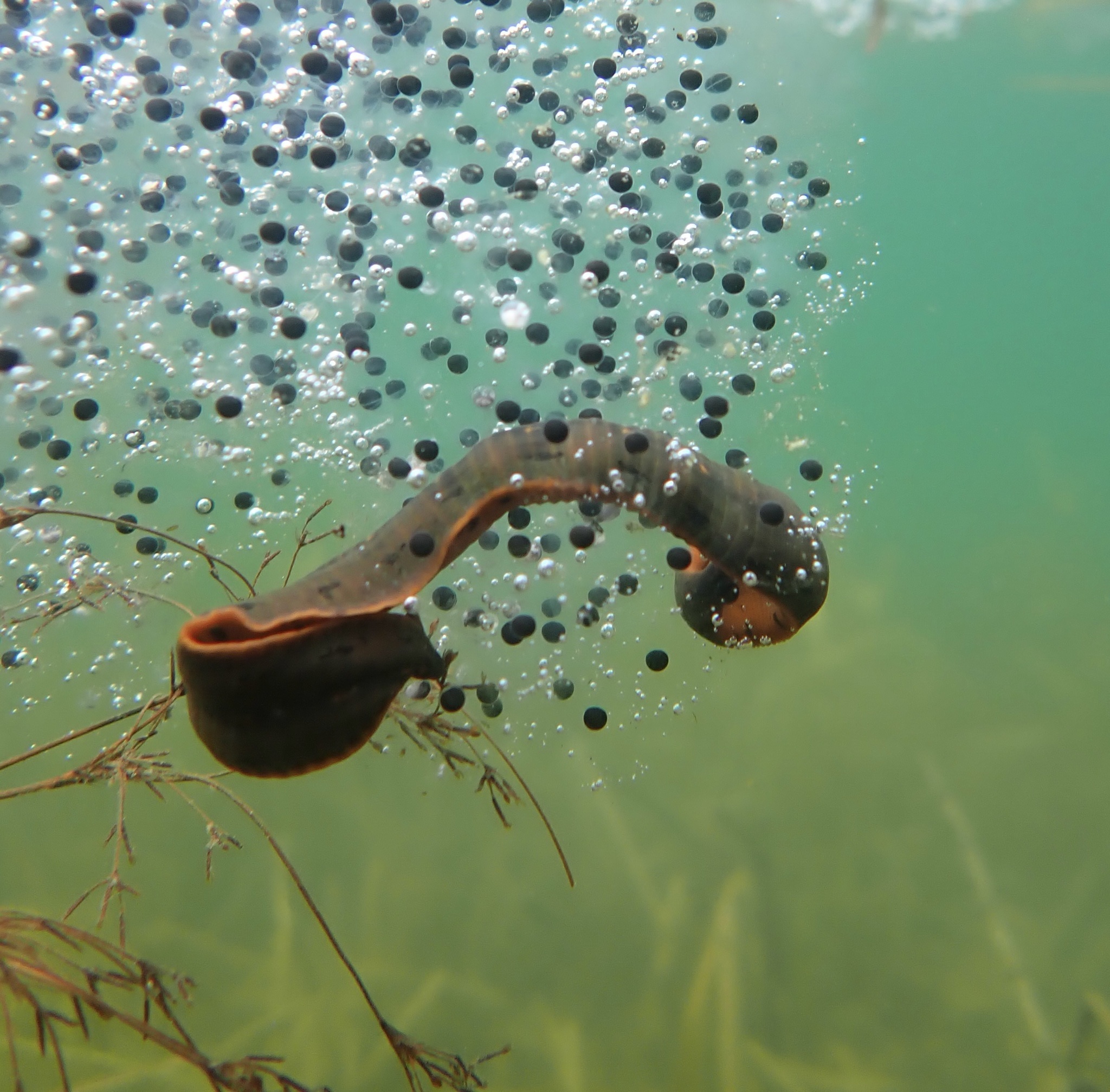 As surreal as this scene looks, predation of wood frog eggs by leeches is actually a relatively common occurrence! Because the egg masses of wood frogs and other frog species in the northeast lack the protective, gelatinous outer layer of spotted and jefferson salamander egg masses, they are more vulnerable to predation by a host of aquatic predators from leeches, to newts, to aquatic insects. While vernal pools are an attractive egg-laying site for many of Vermont’s amphibians due to their lack of fish predators, they are by no means a completely safe nursery for frog and salamander eggs, as evidenced by Erin’s amazing photograph. Wood Frogs combat this inevitable predation by laying an overwhelming number of eggs consisting of 800 to 2,000 embryos per egg mass, certainly more than any leech could eat in one sitting!