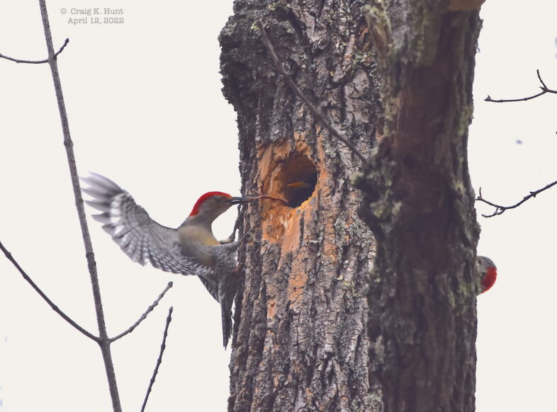 European Starlings are one of the more notorious non-native bird species in North America. Long thought to have been introduced by an eccentric Shakespeare-enthusiast, at least part of that story has recently been debunked. Tree Swallows, Eastern Bluebirds, Black-capped Chickadees, and many other cavity-nesting birds are quite familiar with the European Starlings penchant for moving in to nest cavities when they’re less than welcome. Starlings’ aggressive nest takeovers have contributed in part to the decline of some bird species, though in some instances the avian homeowners are able to kick out the unwelcome guest. Craig’s photos of a Red-bellied Woodpecker pair attempting to yank a European Starling out of their cavity show one such example of a pair fighting back against an avian interloper.