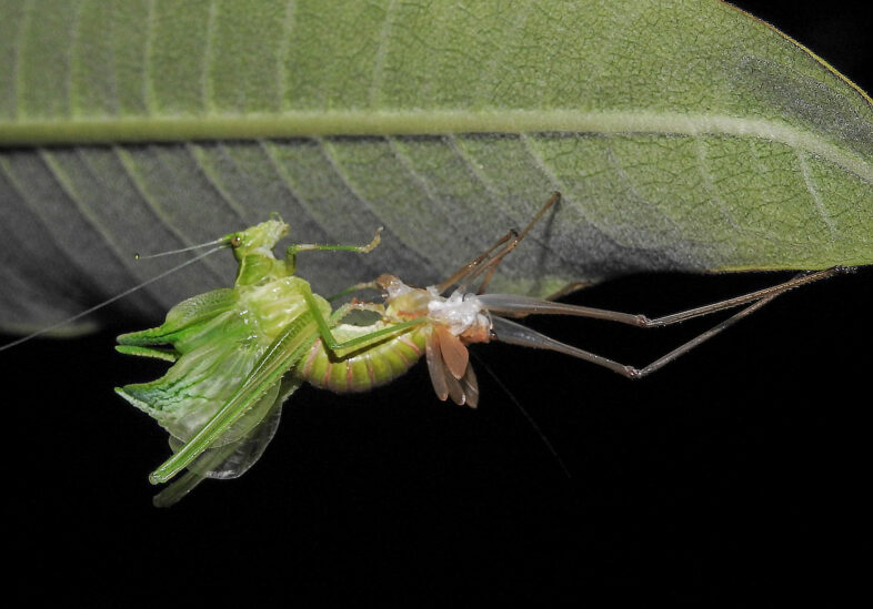 There are 80 grasshopper, cricket and katydid (Orthoptera) species known in Vermont. Six of those are Scudder’s Bush Katydids. The nymph that hatches from an egg looks a lot like an adult without wings. They shed their exoskeletons (called molting) as they grow larger and larger. During their last molt they become winged adults. JoAnne captured this moment. The katydid is sliding out of its old exoskeleton leaving behind the brown, empty legs,the casing for its new wings and body.