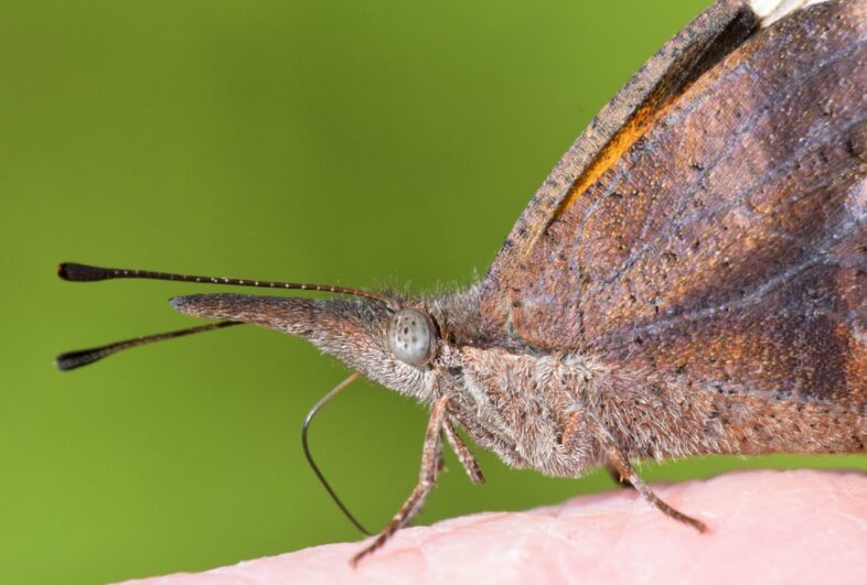 Its elongated mouth-parts resemble the stem of a dead leaf. They use this, combined with their wing shape and coloration, to be camouflaged from predators when hanging upside-down under a tree branch. But they are perhaps best known for their incredible irruptions and migrations that lead to sightings far north of their normal range.