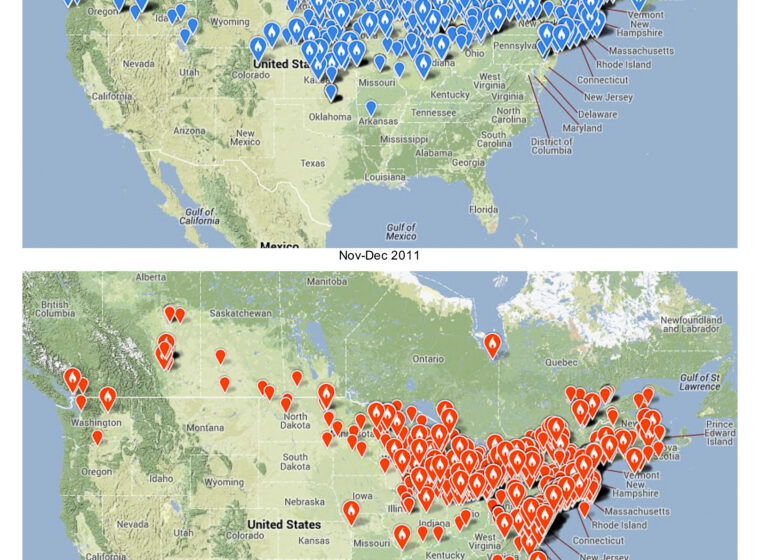The last big Snowy Owl invasion was in 2011 (top map), but it was much more widespread than the one underway now (bottom map). Note how it is mostly focused…