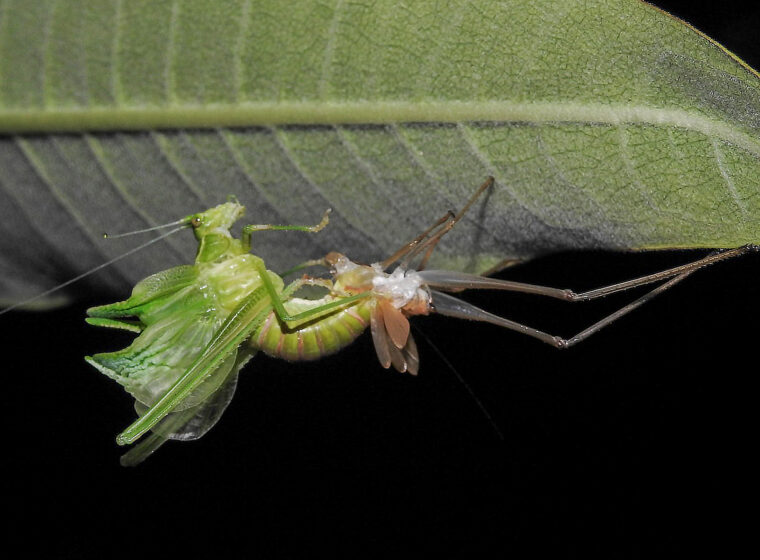 Congratulations to JoAnne Russo for winning the August 2019 Vermont Atlas of Life iNaturalist photo-observation of the month. JoAnne captured this Scudder’s Bush Katydid (Genus Scudderia) in the act of molting under a milkweed leaf.