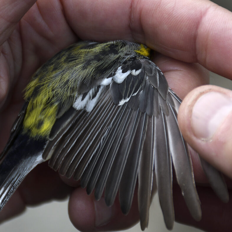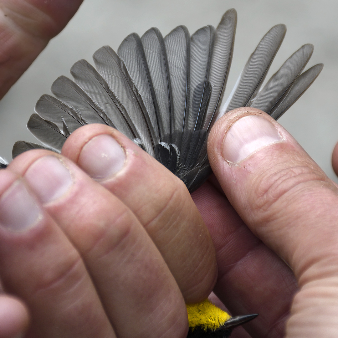Unusually early active wing molt in a male Magnolia Warbler on Mt. Mansfield, 19 June 2019. The innermost 4 primaries are new, #5 is half-grown, and the outermost 4 primaries are old. / © Michael Sargent
