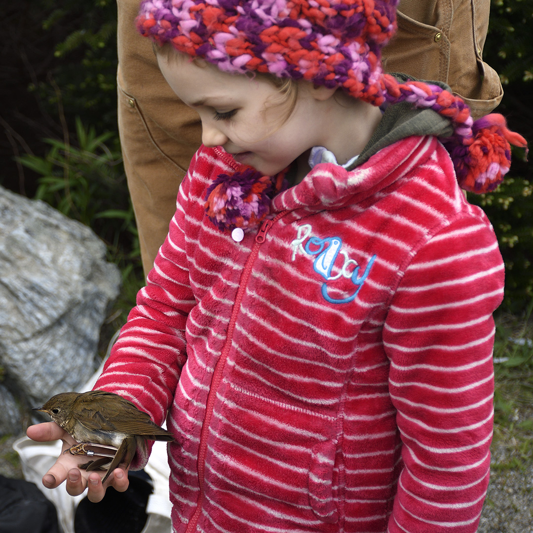 Nora Rogers, a potential next-generation bird conservationist, cradles a banded Bicknell’s Thrush prior to its release. Mt. Mansfield, 19 June 2019. / © Michael Sargent