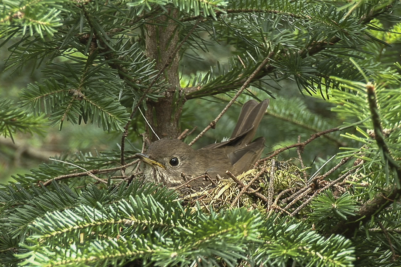 Bicknell’s Thrush (Catharus bicknelli) incubating a nest on Stratton, Vermont. Photo by K.P. McFarland