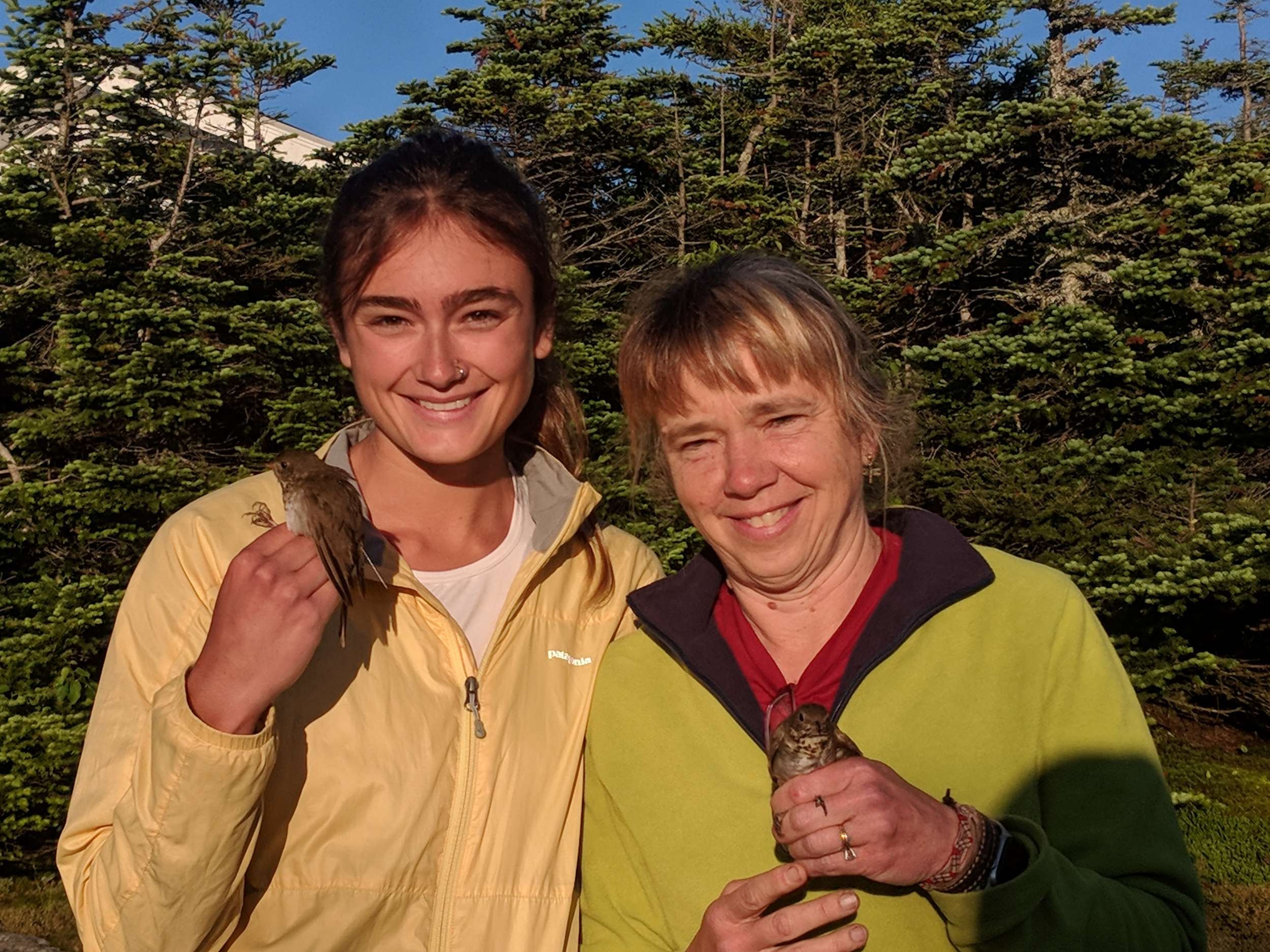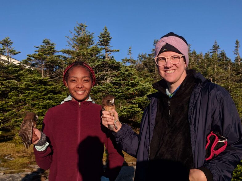 Emily and Julie Filiberti ready to release two banded Bicklnell’s Thrushes in the early morning light on Mansfield’s ridgeline, 7 July 2022. © Nathaniel Sharp