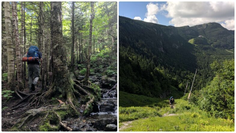 The ascent up Haselton Trail was both grueling and historic for VCE. Kevin Tolan on the trail’s wooded lower portion (left) and grinding out a final push up the Nosedive ski trail, with Mansfield’s summit in the distance (right). © Nathaniel Sharp