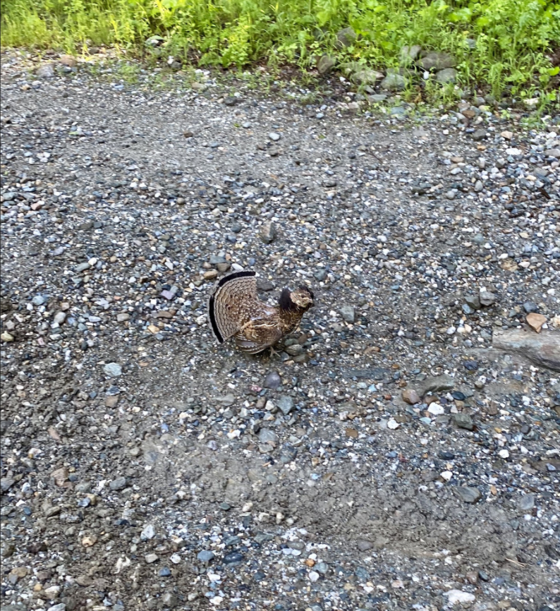 A territorial Ruffed Grouse makes his presence known to two Birder Broker volunteers on a survey in Starksboro, VT. © Beagle Bourgault