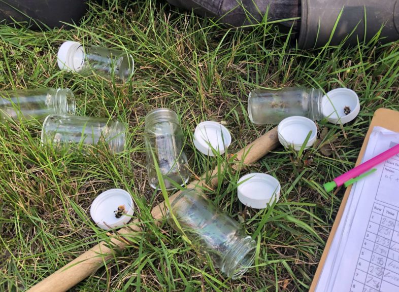 On sunny days (one condition for bumblebee catching is the ability to see your shadow), we walk 200 meters along a transect of tall grass and wildflowers, meeting many spiders and raspberry thorns along the way. I scan surrounding grassy patches looking for an easy prey—Bombus, a notoriously slow and literally “bumbling” bee. They’re hard to miss, both in terms of sight and swing. These bees’ clumsy gait among wildflowers like milkweed, joe pye weed, vetch, jewelweed, and red clover betrays their intentions to feed and subsequently pollinate. Once one appears in my line of sight, I swing my net down, pinch off the net’s end, and carefully coax the now angry creature into a glass vial. I then put that vial on ice in a Coleman cooler designed for 6-packs. This freezes the bee into an icy but temporary coma, which ensures that we can photograph and identify each specimen before releasing it. With this method, we aren’t so much harming as temporarily inconveniencing it.