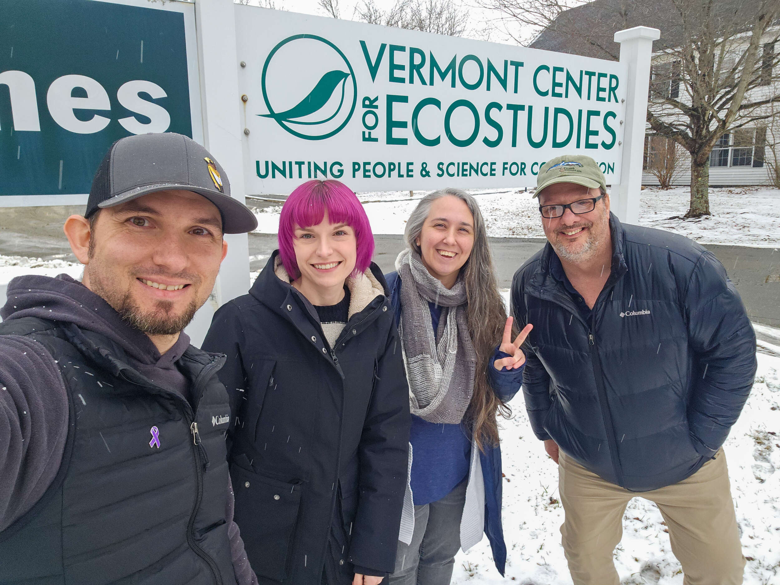 From the left, David Yearny (PA Natural Heritage Program), Mallory Sarver (Powdermill Avian Research Center), Desirée Narango (VCE), and Matt Young (FiRN: Finch Research Network) (Photo credit: David Yearny)