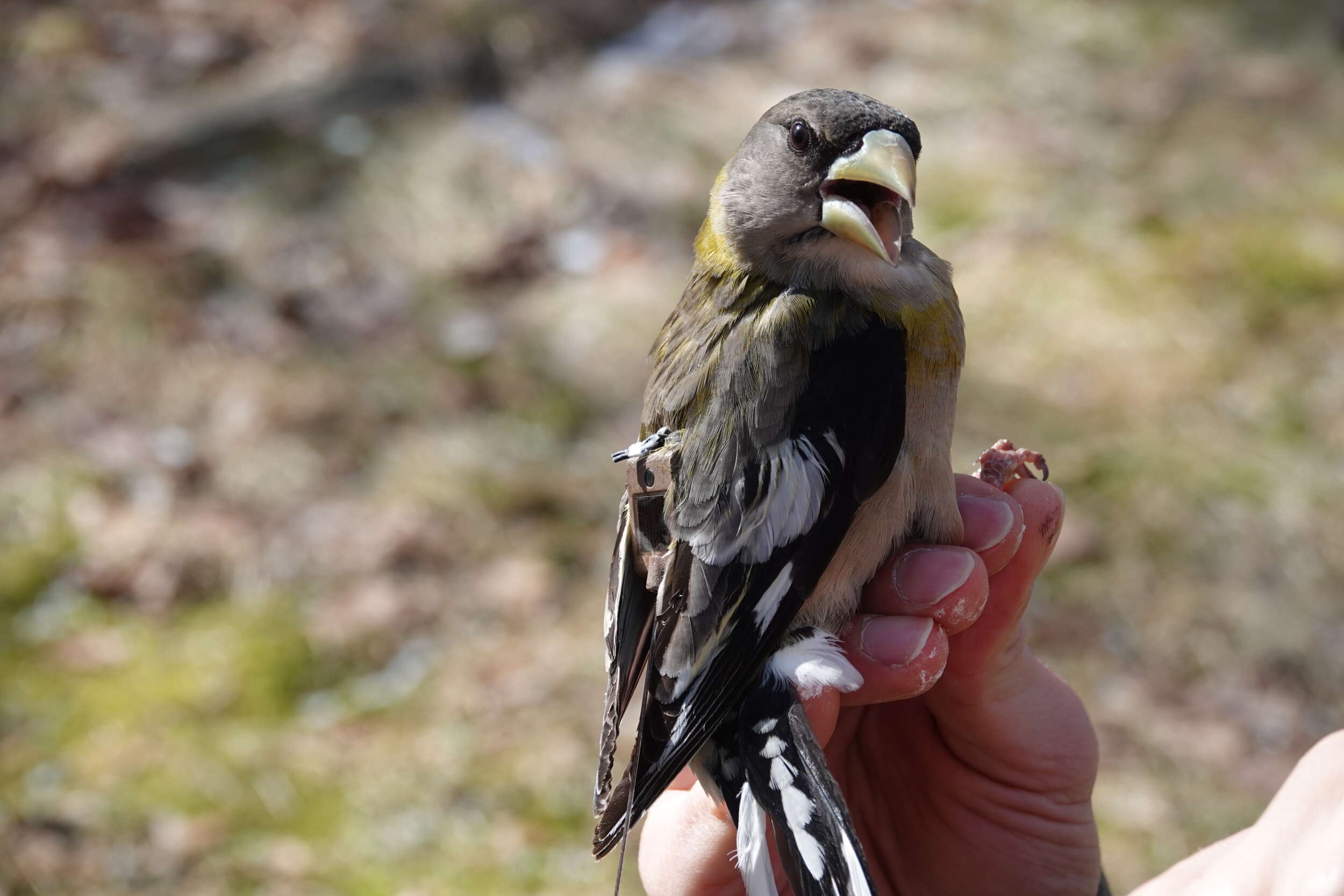Female Evening Grosbeak with a Sunbird satellite tag. Photo credit: Desirée Narango
