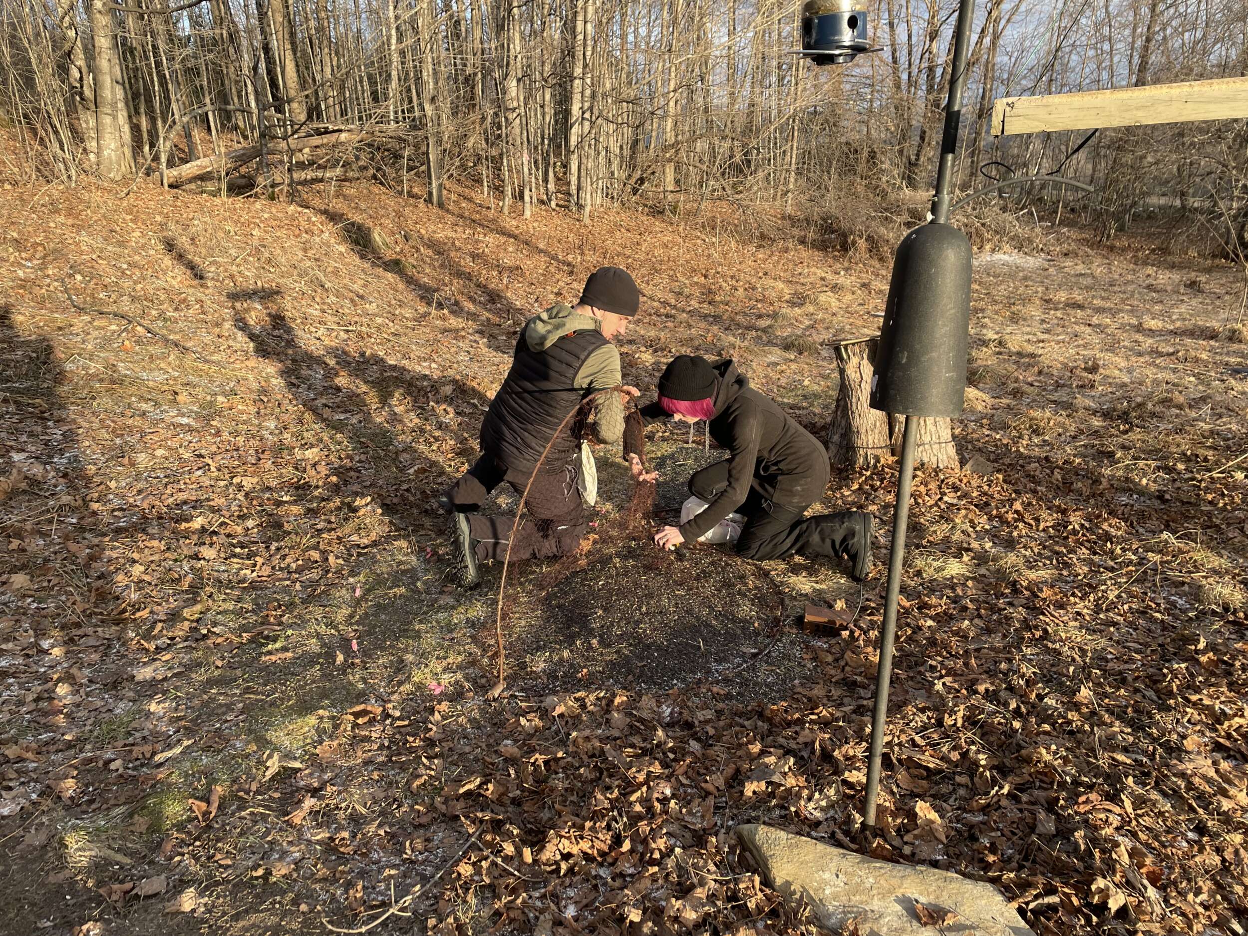 Catching Evening Grosbeaks takes a lot of preparation. On Saturday evening, David and Mallory carefully studied our feeder area, asking questions about where the birds visit and feed. It turns out that grosbeaks are not caught by the usual mist nets we use on Mt. Mansfield. They are much too wary to fall for that. Instead, David and Mallory deploy remotely-triggered bowtraps, similar to those used for hawks.