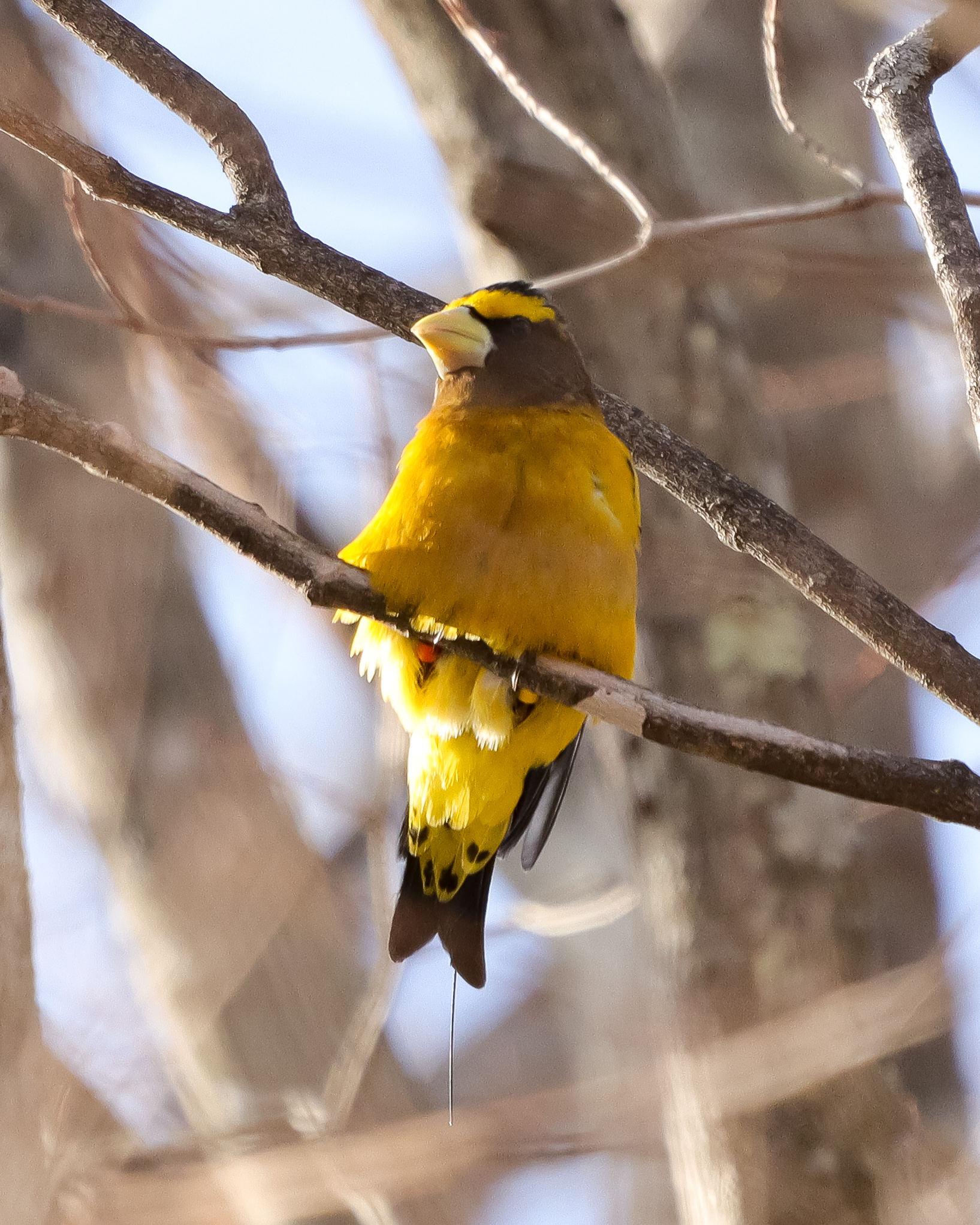 An Evening Grosbeak with a transmitter antennae showing below its tail feathers. Photo credit: David Yeany