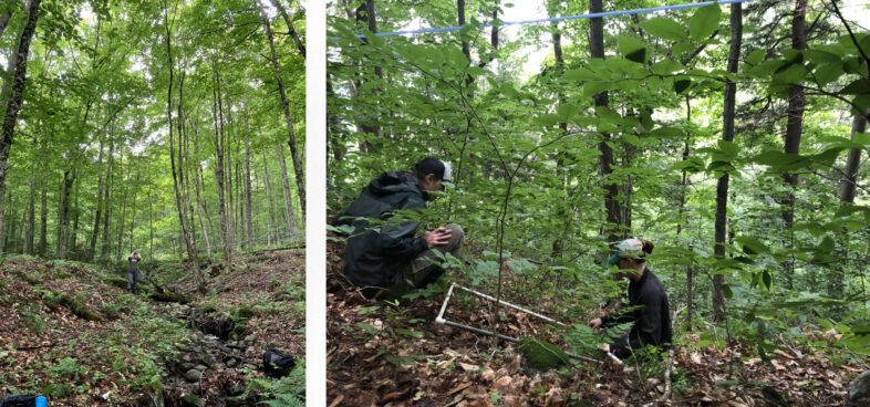 Right: Field tech Gordon Coates (left) and crew lead and PhD student Liza Morse (right), both of UVM, examine a one-by-one meter square to estimate cover of herbaceous plants, bryophytes, bare soil, ferns, and grasses. © Eileen Fitzgerald