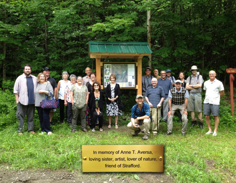 A group of Anne Aversa’s family and friends gathered on June 30 to dedicate this kiosk at the entrance to the Strafford Town Forest in her memory. VCE, the Strafford Conservation Commission and Anne’s three brothers Tom (squatting), Steve (immediately to right of kiosk), and Chuck (standing, fourth from right of kiosk) worked together to make this happen. © Charlie Costa
