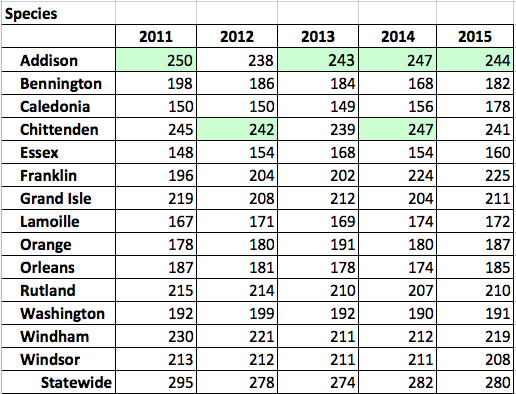 Congratulations to everyone for a fun year of birding. We hope some of you will vie for top honors in 2016! You can follow the scoreboard all year long and see where you rank. Even if you come up short, all of the data collected in Vermont eBird is valuable for science, education, and conservation.