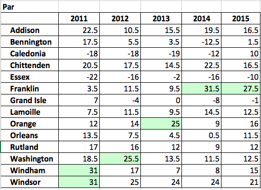 Franklin County, a quiet underdog just a few years ago, topped the field for a second year in a row and claimed the 2015 Quest Cup with a score of 27.5 birds over par. Recall that after last year’s win, by the rules Franklin County had 5 species added to their par for this year. Windsor County was second with 21 species over par.