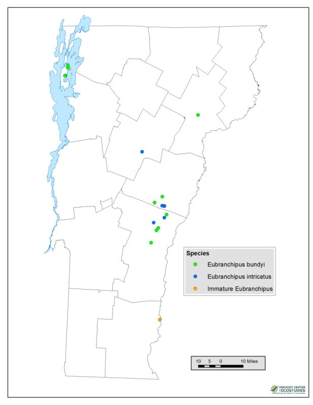 During our surveys this spring, we sampled Fairy Shrimp at 19 vernal pools across Vermont. We discovered Intricate Fairy Shrimp at six pools in Pomfret, Sharon, Strafford, and Berlin. The Knob-lipped Fairy Shrimp was more widespread, occupying 12 pools from the Champlain Islands, west to Danville, and south to Woodstock (Fig. 1). The shrimp we collected at a pool in Westminster hadn’t matured, and therefore couldn’t be identified to species by our partner on this project, Dr. Christopher Rogers of the Kansas Biological Survey. The Westminster pool was also a site where we hoped to find the Spring Fairy Shrimp (E. vernalis), which is common in Massachusetts and southern New England. We’re also hoping to find the Holman Fairy Shrimp (E. holmanii), which has been documented in both NY and Quebec.