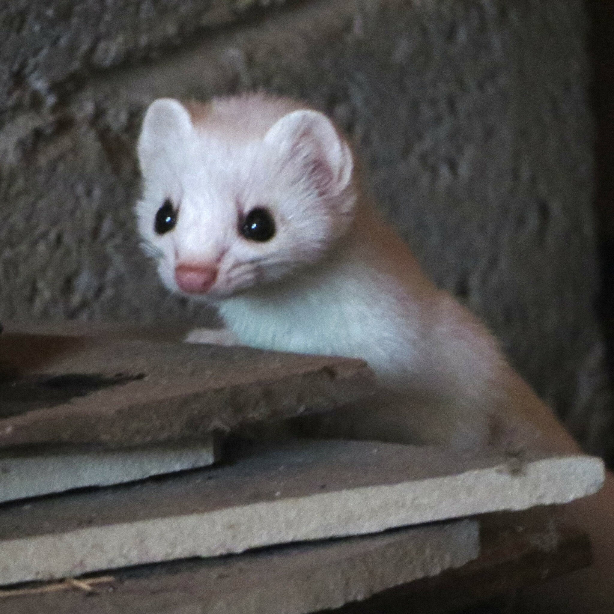 A Short-tailed Weasel with snowy white fur peers out from behind stacked stone slabs. iNat user @cgbb2004