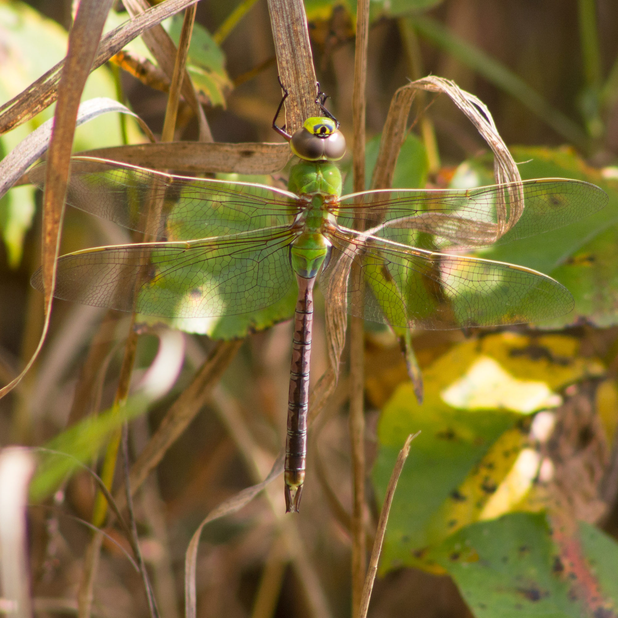 North America’s most abundant and widespread migrant dragonfly is the Common Green Darner. In the spring, just after the ice has disappeared from the ponds, they suddenly appear, well before any local dragonflies have emerged. They breed soon after arriving, and their nymphs develop quickly in water warmed by the spring and summer sun. Many adults emerge from the ponds in August. They feast on insects to pack on fat, perhaps increasing their weight by up to a third. But instead of breeding at their natal site, they begin a southward migration in autumn that may span a month or even longer.
