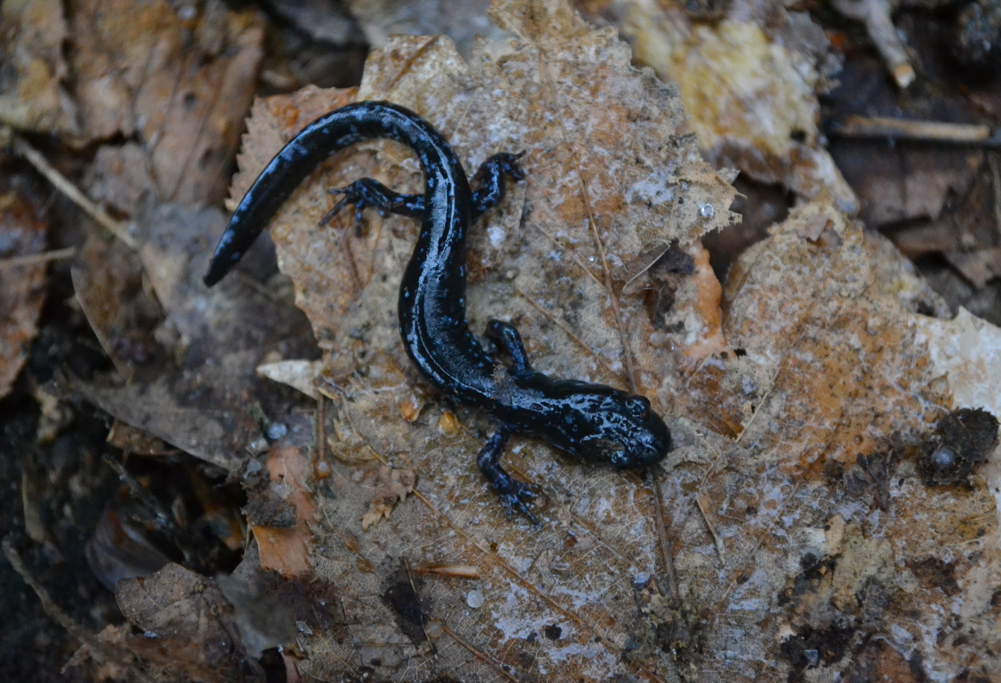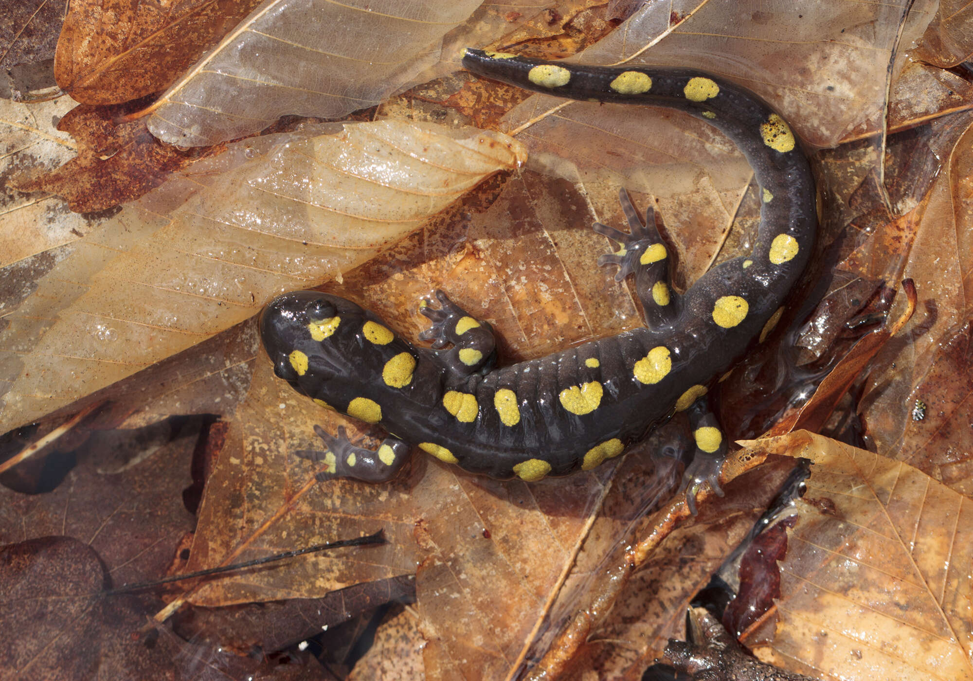 Male Spotted Salamanders leave their hibernation burrows ahead of the females and arrive first at the pools. They form large balls of wiggling males called congresses. As females arrive, individual males separate from the congress and perform a courtship dance with a female. They circle and put their heads under each other’s tails. The male may climb on her back and rub her with his chin. He then swims away wiggling his tail. If the female is interested, she will follow him. He leads her to a sperm packet, called a spermatophore, he deposited earlier on submerged leaves or twigs on the bottom of the pool. She picks up a packets through her cloaca, an opening under the base of the tail used for egg-laying, excreting waste, and of course egg fertilization. The female may collect packets from several males. She then lays several hundred eggs in small gelatinous balls.