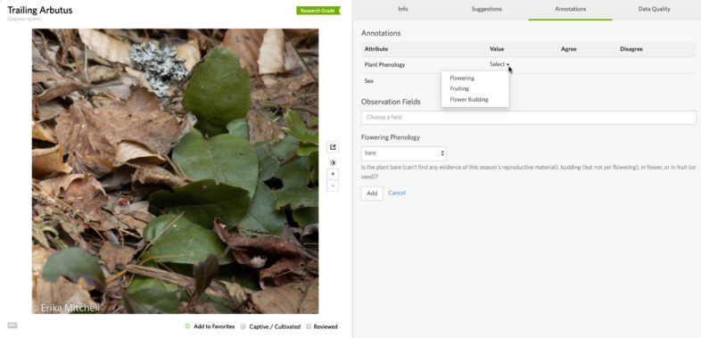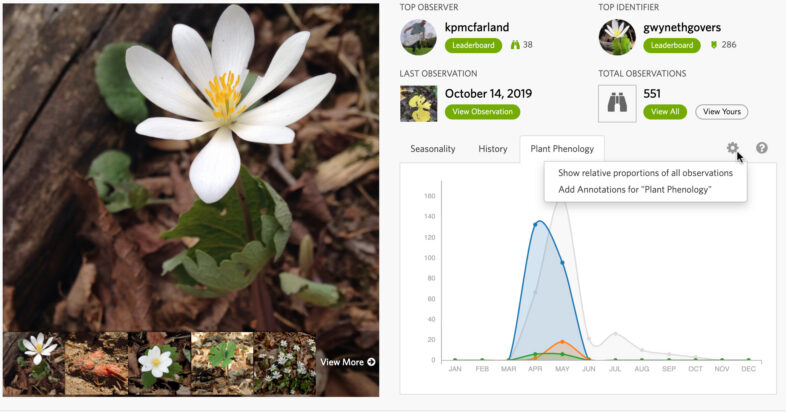 You can help us annotate plant records with their flowering status. Visit a species account, like Bloodroot, for example (below). After you learn more about the plant on the page, click the little gear icon and select ‘Add Annotations for Plant Phenology.’